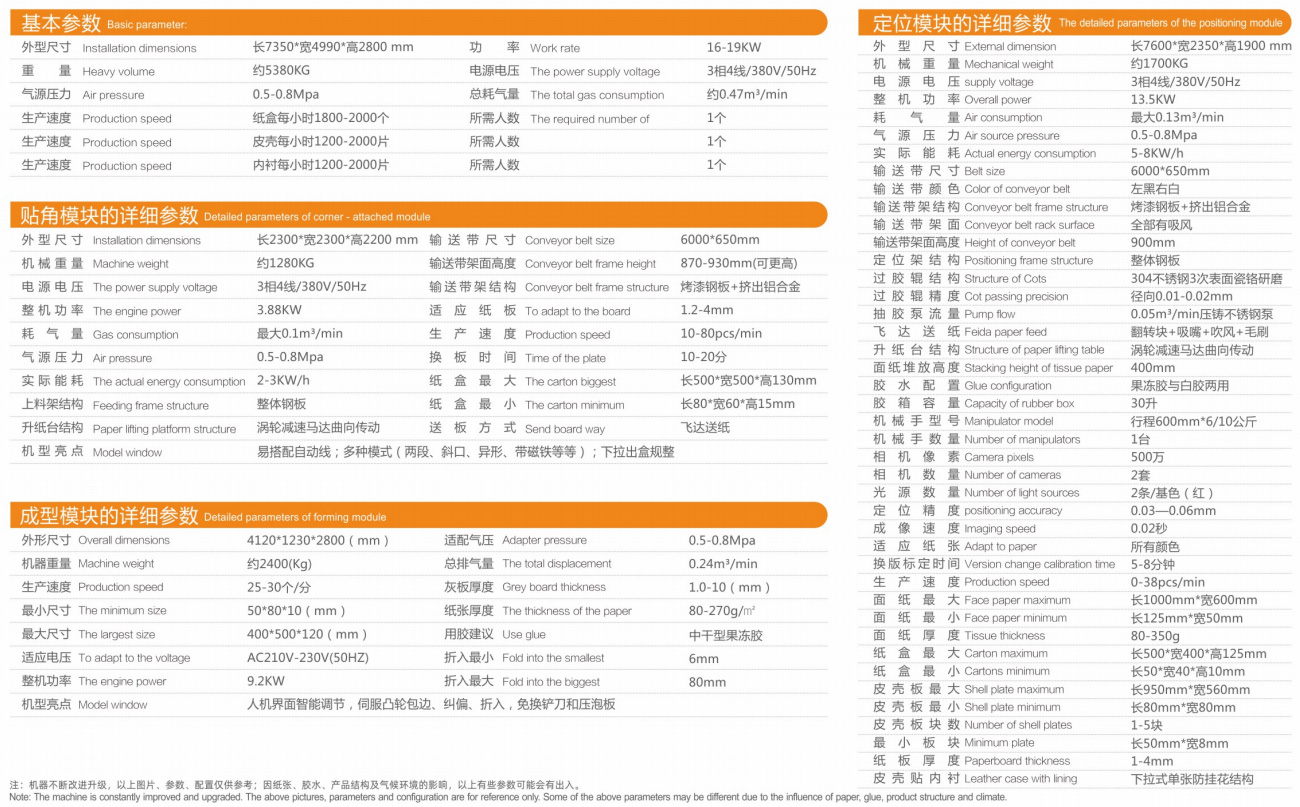 該機主要分為定位模塊、貼角模塊(kuài)和成型模塊三大部分,可實現各類紙(zhǐ)盒、木盒(hé)、膠盒生產時的自動送紙、自動過膠、自動貼角、自動定位、自動(dòng)成型和自動(dòng)壓泡等,係列工藝工序的自動完成,轉(zhuǎn)版速度快,製(zhì)作(zuò)盒體精美。定位模塊的黑白(bái)皮(pí)帶、雙鏡(jìng)頭、自動糾偏、皮殼(ké)板貼襯定位、五片板定位。貼角模塊的不粘膠膠帶槽、雙升紙台。成型模塊的智能(néng)調節、自動鎖固、伺服凸輪動作、免換鏟刀和壓泡板等,均由我司自行研發設計生(shēng)產,並獲得多項國家專利。